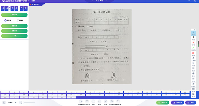 教師通過大屏展示測驗考題,將紙質(zhì)試題轉(zhuǎn)化電子形式展示,節(jié)約成本的同時也能夠讓學(xué)生清晰地看到試題。學(xué)生通過按鈕進(jìn)行作答,大屏實時展示答題狀況。