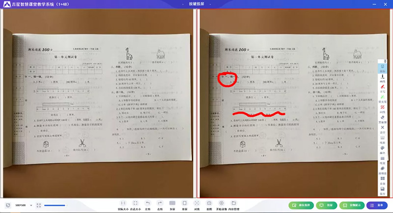同時(shí),也可實(shí)現(xiàn)原始作業(yè)和修改作業(yè)的對(duì)比,使用對(duì)比教學(xué)功能,即可在大屏展示學(xué)生原始作業(yè)和點(diǎn)評(píng)后的修改作業(yè)。讓學(xué)生更直觀地看到作業(yè)在哪些地方修改了,引導(dǎo)學(xué)生思考修改的原因和產(chǎn)生的效果。