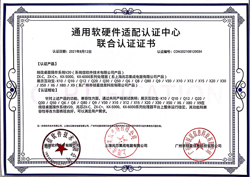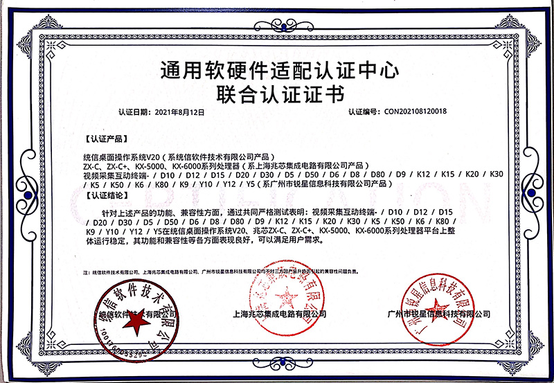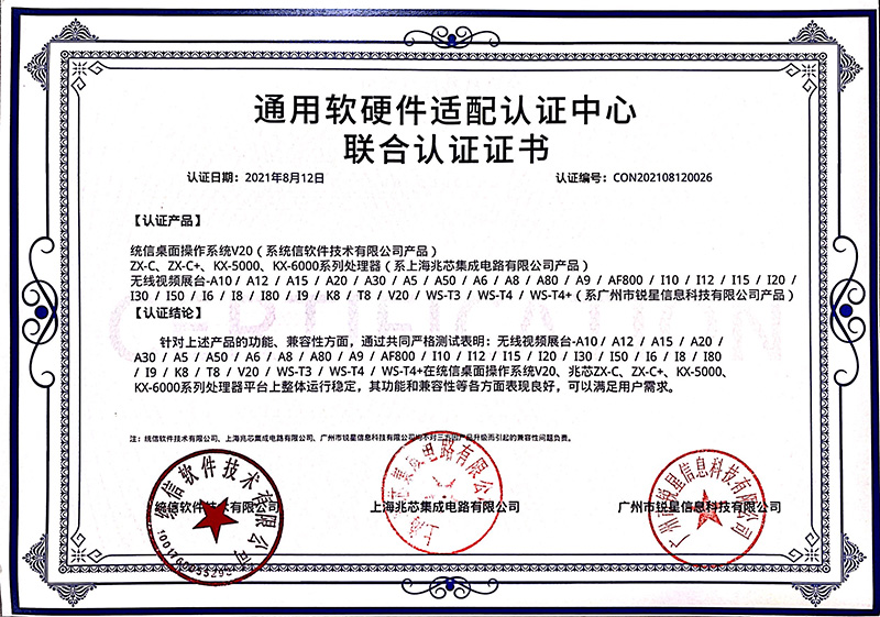 兆芯認(rèn)證證書(無線視頻展臺、視頻采集互動(dòng)終端)