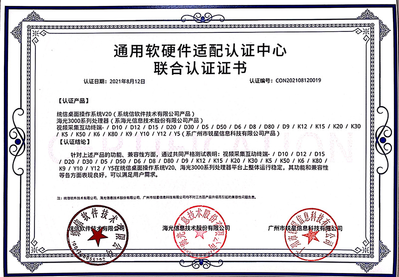 海光認(rèn)證證書(無線視頻展臺、視頻采集互動(dòng)終端)