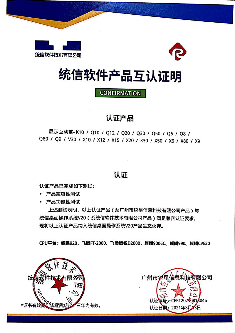 統(tǒng)信認(rèn)證證書(展示互動(dòng)寶、無線微錄儀)
