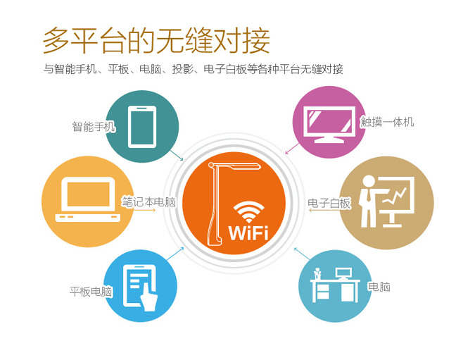無線視頻展臺可以通過WIFI同步連接到電子白板、一體機(jī)、電腦、筆記本、平板、手機(jī),在課堂上用各種設(shè)備觀看的同時還可以將老師的教學(xué)過程錄制下來,隨時隨地回放視頻,方便學(xué)生溫故知新 。