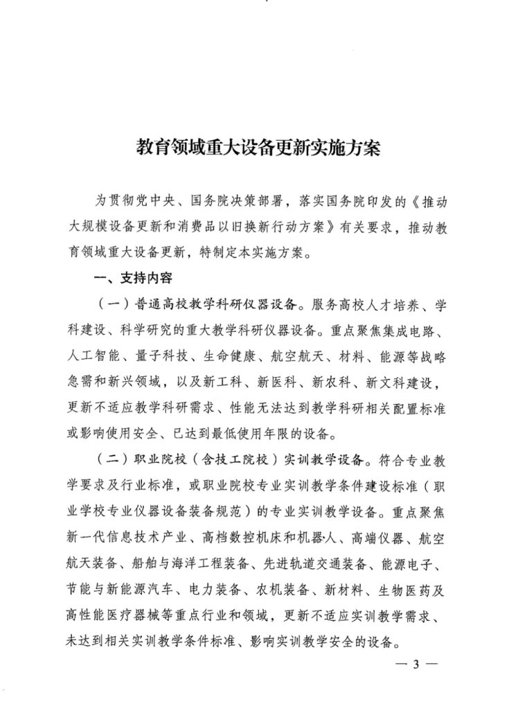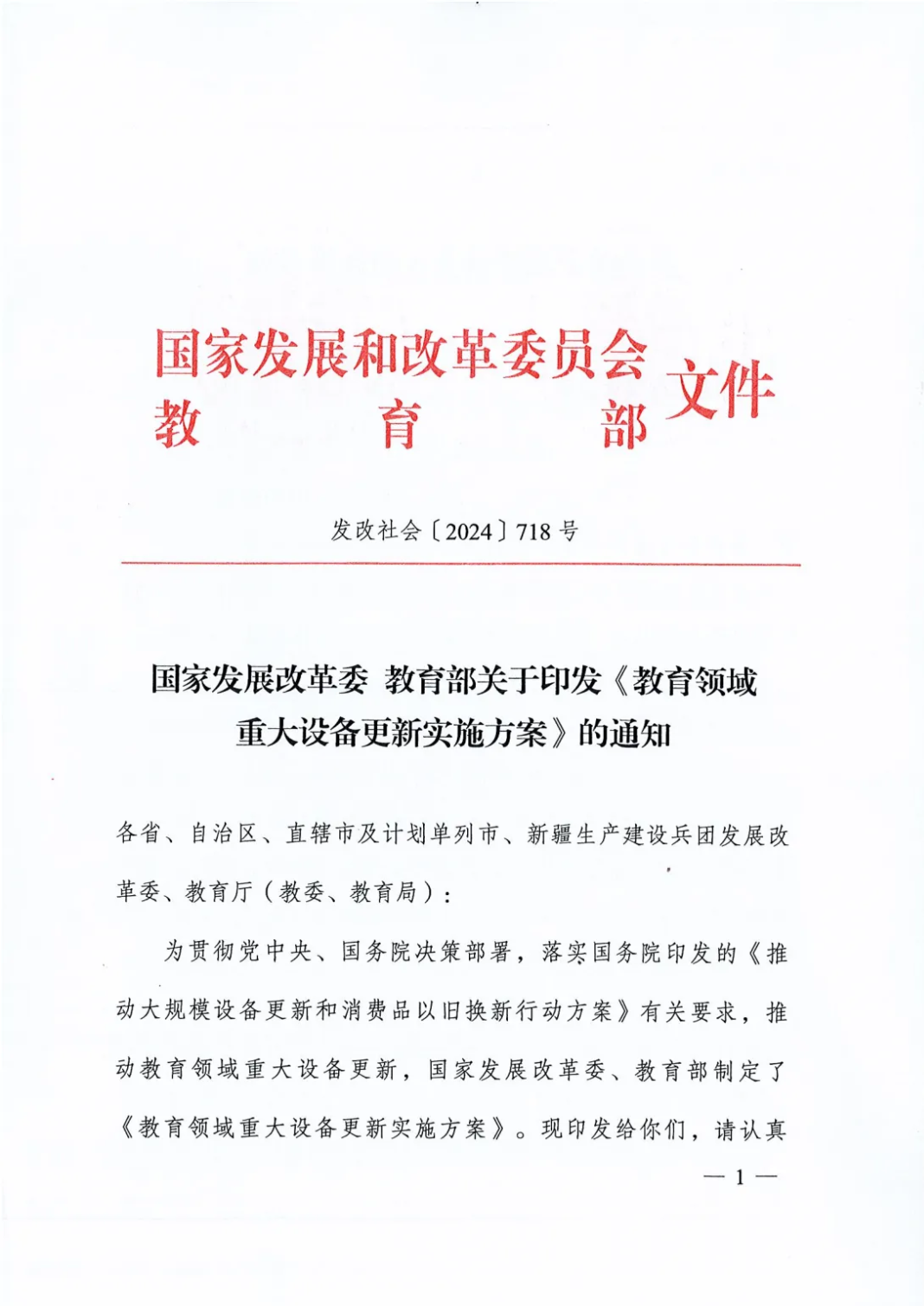 為響應(yīng)黨中央、國務(wù)院的號召,落實《推動大規(guī)模設(shè)備更新和消費品以舊換新行動方案》,國家發(fā)改委、教育部聯(lián)合制定并印發(fā)《教育領(lǐng)域重大設(shè)備更新實施方案》,為教育領(lǐng)域設(shè)備更新提供明確方向和有力支持。