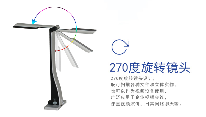 拍攝鏡頭 機(jī)械折臂270度翻轉(zhuǎn)式:90度可拍攝文稿;180度可拍攝課堂活動(dòng),用作簡(jiǎn)易的錄播系統(tǒng);270度可錄制微課